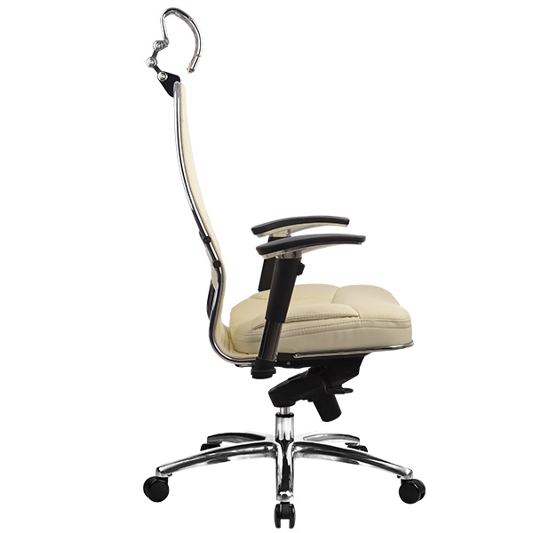Отличие от других моделей серии Samurai: - укороченная натяжная кожаная спинка со съемным 3D подголовником, - мягкое объемное сиденье из износостойкого перфорированного материала NewLeather*, - регулируемые 4D подлокотники. Преимущества: Абсолютно эргономичная форма спинки соответствует анатомической форме тела человека. Новая эргономичная форма спинки, помимо улучшения эргономических свойств, придает креслу устойчивость при максимальном отклонении. Двухзонная регулировка подпора поясницы обеспечивает идеальную поддержку спины независимо от комплекции сидящего, Сверхпрочный стальной каркас спинки и сиденья, покрытый зеркальным хромом, Гарантия 10 лет: на стальной каркас, Синхромеханизм качания MULTIBLOCK, благодаря раздельному синхронному отклонению спинки и сиденья, позволяет телу периодически разгибаться, что улучшает кровоток и разминает мышцы спины, Возможность фиксации кресла в любом положении отклонения, Смещенный вперед центр качания позволяет стопам сидящего, при отклонении кресла, оставаться на полу, сосуды не пережимаются - сохраняется ощущение легкости в ногах, Регулировка глубины сиденья с помощью специального слайдера, обеспечивает эргономически правильную посадку пользователя в кресле, создавая дополнительный комфорт и удобство. Предусмотрена возможность фиксации глубины сиденья в пяти позициях. Пятилучье зеркальное литое с противооткатными полиуретановыми роликами, Противооткатные полиуретановые ролики обеспечивают дополнительную безопасность эксплуатации кресла: без нагрузки - предотвращают случайное перемещение кресла, при сидении - позволяют легко перемещаться. Ролики долговечные, бесшумные, не оставляют следов и царапин на полу, увеличенного диаметра (60 мм), Подголовник: Съемный 3D подголовник из перфорированного износостойкого материала NewLeather*, обеспечивает идеальную поддержку головы в любом положении. Регулируется по высоте, глубине, углу наклона. Каркас подголовника: стальной, покрытый зеркальным хромом, Регулируемые 4D подлокотники настраиваются под индивидуальные особенности рабочего места пользователя, разгружают плечи и предплечья сидящего, регулируются по высоте, углу поворота, а также меняется расстояние между подлокотниками, *регулировка высоты *регулировка расстояния между подлокотниками *регулировка угла поворота *регулировка вперед-назад Мягкое объемное сиденье обеспечивает дополнительный комфорт и ощущение мягкости кожаного дивана, Материалы обивки спинки и сиденья: перфорированный износостойкий материал NewLeather*. *NewLeather ? инновационный экологически чистый материал, производимый из натуральной кожи, армирован нейлоновой нитью, имеет волокнистую натуральную основу, благодаря чему данный материал не уступает обычной натуральной коже по эластичности, прочности и износостойкости. При этом перфорация обеспечивает уникальные ?дышащие? свойства, не уступающие даже ткани и значительно превосходящие ?дышащие? свойства обычной натуральной кожи. **Высота сиденья в верхнем и нижнем положении может быть изменена, в зависимости от модели применяемого газ-лифта.