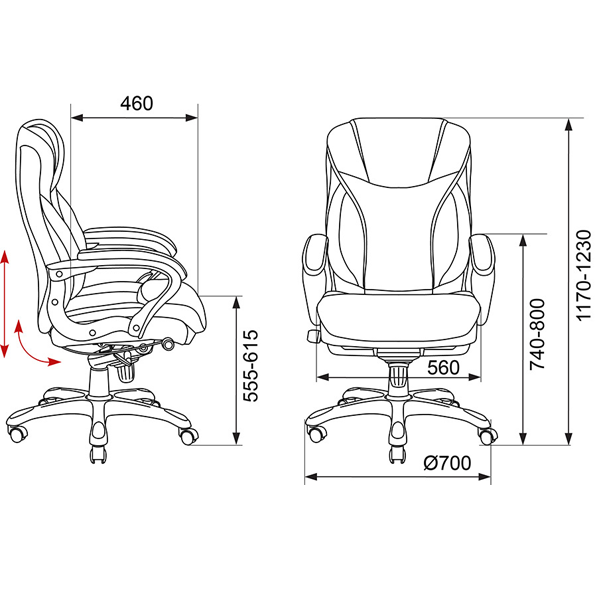 Конструкция: Механизм со смещенной осью качания с возможностью фиксации в нескольких положениях Регулировка поясничной поддержкивперед-назад Регулировка высоты газлифт Крестовина пластиковая крашеная с защитными накладками Подлокотники пластиковые крашеные с мягкими накладками из рец.кожи