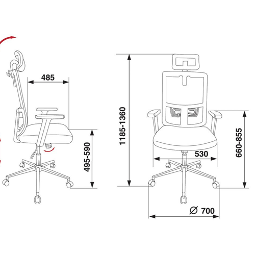 Синхромеханизм качания с фиксацией в любом положении Поясничная поддержка спины Регулировка высоты (газлифт) Подголовник регулируемый по высоте и углу наклона Вешалка для легкой одежды Подлокотники пластиковые, регулируемые по высоте Крестовина хромированная