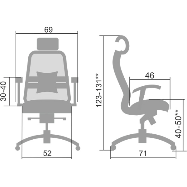 Отличие от других моделей серии Samurai: - укороченная натяжная сетчатая спинка со съемным 3D подголовником, - мягкое объемное сиденье из износостойкого перфорированного материала NewLeather*, - регулируемые 4D подлокотники. Преимущества: Абсолютно эргономичная форма спинки соответствует анатомической форме тела человека, Новая эргономичная форма спинки, помимо улучшения эргономических свойств, придает креслу устойчивость при максимальном отклонении. Двухзонная регулировка подпора поясницы обеспечивает идеальную поддержку спины независимо от комплекции сидящего, Сверхпрочный стальной каркас спинки и сиденья, покрытый зеркальным хромом, Гарантия 10 лет: на сетчатую ткань, армированную арамидным волокном и на стальной каркас, Синхромеханизм качания MULTIBLOCK, благодаря раздельному синхронному отклонению спинки и сиденья, позволяет телу периодически разгибаться, что улучшает кровоток и разминает мышцы спины, Возможность фиксации кресла в любом положении отклонения, Смещенный вперед центр качания позволяет стопам сидящего, при отклонении кресла, оставаться на полу, сосуды не пережимаются - сохраняется ощущение легкости в ногах, Регулировка глубины сиденья с помощью специального слайдера, обеспечивает эргономически правильную посадку пользователя в кресле, создавая дополнительный комфорт и удобство. Предусмотрена возможность фиксации глубины сиденья в пяти позициях. Пятилучье зеркальное литое с противооткатными полиуретановыми роликами, Противооткатные полиуретановые ролики обеспечивают дополнительную безопасность эксплуатации кресла: без нагрузки - предотвращают случайное перемещение кресла, при сидении - позволяют легко перемещаться. Ролики долговечные, бесшумные, не оставляют следов и царапин на полу, увеличенного диаметра (60 мм), Подголовник: Съемный 3D подголовник из перфорированного износостойкого материала NewLeather*, обеспечивает идеальную поддержку головы в любом положении. Регулируется по высоте, глубине, углу наклона. Каркас подголовника: стальной, покрытый зеркальным хромом, Регулируемые 4D подлокотники настраиваются под индивидуальные особенности рабочего места пользователя, разгружают плечи и предплечья сидящего, регулируются по высоте, углу поворота, а также меняется расстояние между подлокотниками, *регулировка высоты *регулировка расстояния между подлокотниками *регулировка угла поворота *регулировка вперед-назад Мягкое объемное сиденье обеспечивает дополнительный комфорт и ощущение мягкости кожаного дивана, Материалы обивки спинки: сверхпрочная сетчатая ткань, армированная арамидным волокном, Материалы обивки сиденья: перфорированный износостойкий материал NewLeather*, Сетчатая ткань, армированная высокопрочным арамидным волокном, позволяет Вашему телу свободно ?дышать?, сохраняя температурный баланс, исключая любые зоны перегрева в местах соприкосновения. Полимерная плетеная ткань с невероятной прочностью и износостойкостью. **Высота сиденья в верхнем и нижнем положении может быть изменена, в зависимости от модели применяемого газ-лифта.