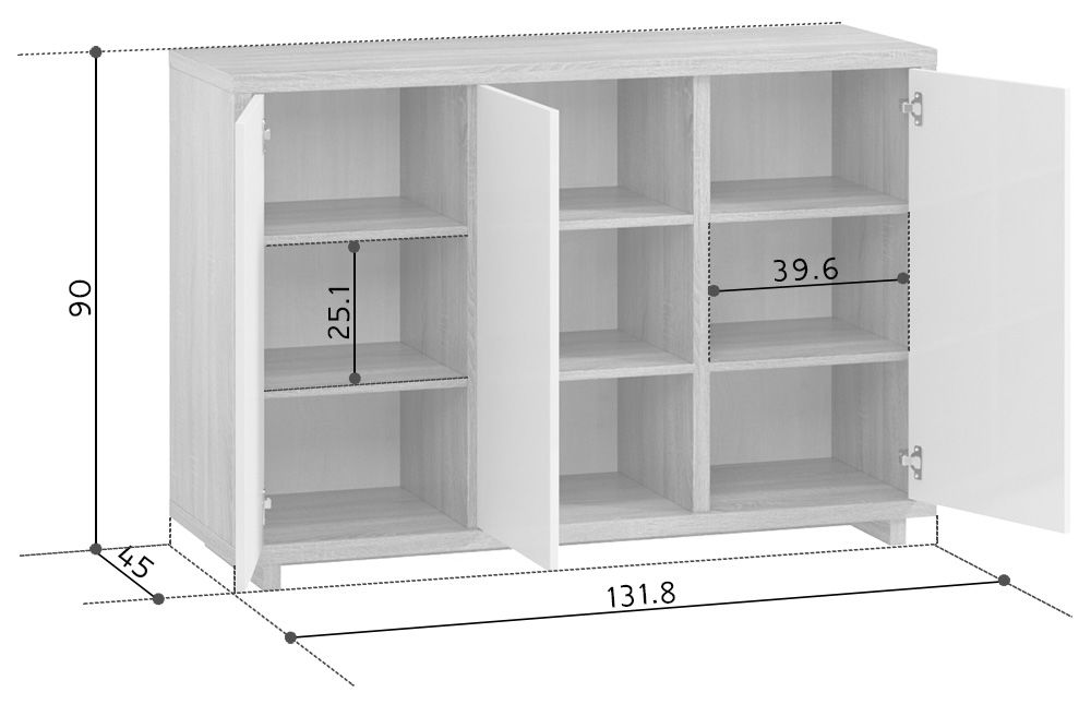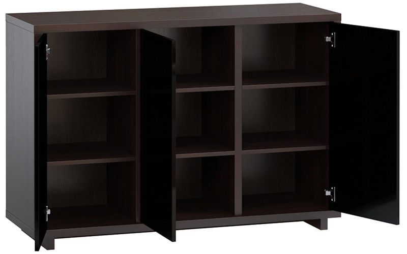 Вместительный и лаконичный комод Дуглас выгодно дополнит интерьер в стиле хай-тек. Особенно хорошо он будет смотреться в паре с широкоформатным телевизором или современной аудиосистемой. Благодаря глянцевым фасадам модель выглядит очень эффектно. В конструкции три распашных отделения, в каждом из которых по три полки.
