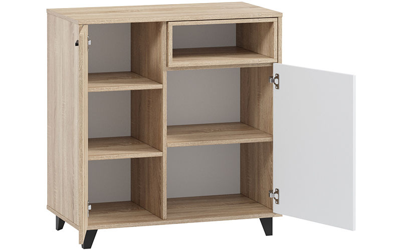 Стильный комод модель из яркой коллекции Концепт. Дизайнеры использовали беспроигрышную комбинацию цветов и фактур: корпус выполнен в красивом оттенке Дуб Сонома, а дополняют его гладкие фасады и контрастная белая вставка. Сдержанный дизайн модели подчеркнут длинными узкими ручками из массива дерева.