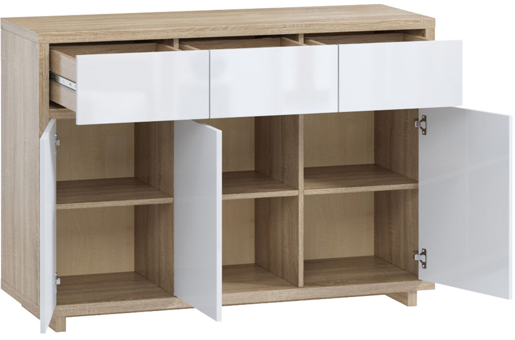 Вместительный и лаконичный комод Дуглас выгодно дополнит интерьер в стиле хай-тек. Особенно хорошо он будет смотреться в паре с широкоформатным телевизором или современной аудиосистемой. Благодаря глянцевым фасадам модель выглядит очень эффектно. В конструкции три выдвижных и три распашных отделения, в каждом из которых по две полки.