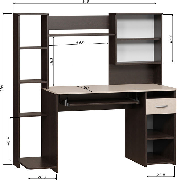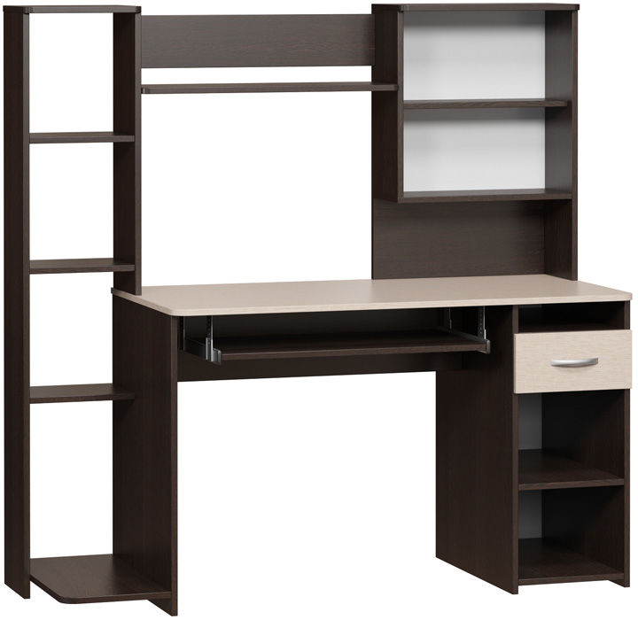 Удобный компьютерный стол с большим количеством полок. Такое решение прекрасно подойдет для организации места для учебы. В боковом стеллаже на нижней полке можно удобно разместить системный блок. За распашными дверками также находятся полки. Стол оборудован выдвижным ящиком и полкой для клавиатуры, которую можно не устанавливать, если вы планируете работать за ноутбуком. Высота полки под системный блок 404 мм, Проем под монитор 442 х 688 мм (под монитор 20). Изделие универсальное при сборке - блок со стеллажом и блок с закрытыми полками можно расположить с любой стороны. Столешница изготовлена из ЛДСП отечественного производства толщиной 16 мм, отделана кромкой ПВХ 2 мм.