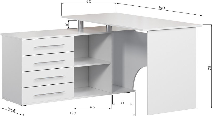 Угловой компьютерный стол с двумя рабочими поверхностями. Основная столешница имеет ширину 140 см, позволяя разместить компьютер и рабочие материалы. На малой столешнице 120 см, удобно держать под рукой книги, папки, канцелярию. Стол оборудован тумбой с четырьмя ящиками, открытыми полками и нишей под системный блок. Такая модель компьютерного стола позволяет организовать функциональную рабочую зону как в домашнем кабинете, так и в офисе. Особенность модели задняя стенка из ЛДСП, что позволит расположить стол не только у стены, но и в любом удобном месте, не нарушая интерьерной композиции. Внутренний размер ящиков 45.6х34.6 см. Размер ниши под системный блок (ВхШхГ) 56.5х22х44 см.