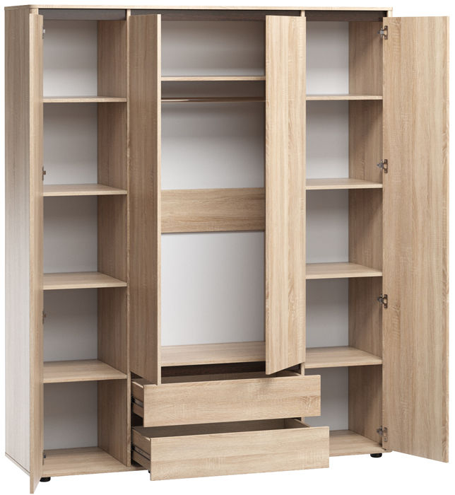 Форест-4-1 - распашной четырехдверный шкаф, оборудованный всем необходимым. За центральными створками расположен вместительный отсек со штангой. Внизу два широких выдвижных ящика. По бокам два отделения, в каждом из которых по пять полок. Шкаф выглядит лаконично за счет отсутствия фурнитуры на фасадах и теплого древесного оттенка с контрастными МДФ-вставками.