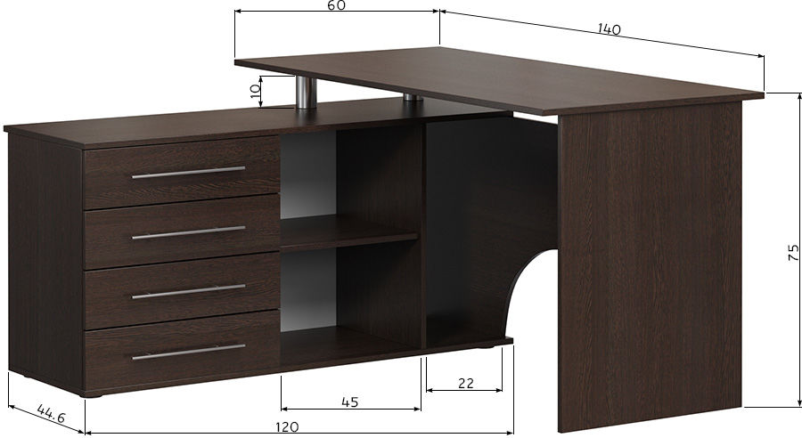 Угловой компьютерный стол с двумя рабочими поверхностями. Основная столешница имеет ширину 140 см, позволяя разместить компьютер и рабочие материалы. На малой столешнице 120 см, удобно держать под рукой книги, папки, канцелярию. Стол оборудован тумбой с четырьмя ящиками, открытыми полками и нишей под системный блок. Такая модель компьютерного стола позволяет организовать функциональную рабочую зону как в домашнем кабинете, так и в офисе. Особенность модели задняя стенка из ЛДСП, что позволит расположить стол не только у стены, но и в любом удобном месте, не нарушая интерьерной композиции. Внутренний размер ящиков 45.6х34.6 см. Размер ниши под системный блок (ВхШхГ) 56.5х22х44 см.