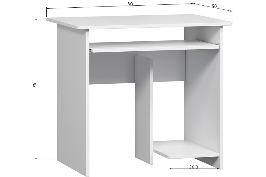 Стильный компактный компьютерный стол идеально подойдет для небольшой комнаты. Лаконичные формы и белый цвет исполнения делает стол универсальным для любого интерьера. Размеры столешницы 800 х 600 мм позволяют установить монитор любой диагонали. Стол оборудован выдвижной полкой для клавиатуры, а в основании с правой стороны расположена ниша под системный блок.