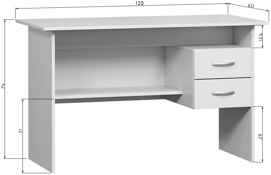 Большой письменный стол со встроенной тумбой. Внизу задней стенки также находится небольшая полочка. Встроенная тумба состоит из двух ящиков с открытой нишей сверху. За таким столом удобно будет себя чувствовать и школьник и студент. Стол также можно использовать как компьютерный. Внутренний размер ящиков 21.1х35.4 см. Высота от пола до ящиков составляет 29 см, высота от пола до полки под столом 31 см. Высота полочки над ящиками 12.4 см. Стол универсален при сборке, тумбу можно расположить с любой стороны. Столешница изготовлена из ЛДСП отечественного производства толщиной 16 мм, отделана кромкой ПВХ 2 мм.