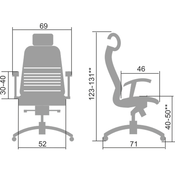 Отличие от других моделей серии Samurai: - укороченная спинка со съемным 3D подголовником, - натяжное кожаное сиденье и спинка (дополнительно комплектуется съемным особо мягким кожаным чехлом для сиденья) из износостойкого перфорированного материала NewLeather, - регулируемые 4D подлокотники. Преимущества: Абсолютно эргономичная форма спинки соответствует анатомической форме тела человека. Новая эргономичная форма спинки, помимо улучшения эргономических свойств, придает креслу устойчивость при максимальном отклонении. Двухзонная регулировка подпора поясницы обеспечивает идеальную поддержку спины независимо от комплекции сидящего, Двухзонная регулировка жесткости сиденья позволяет достичь максимального удобства (сиденье можно сделать мягче или жестче), а также при необходимости настроить угол наклона сиденья за счет разного натяжения передней и задней зоны, Сверхпрочный стальной каркас спинки и сиденья, покрытый зеркальным хромом, Гарантия 10 лет: на стальной каркас, Синхромеханизм качания MULTIBLOCK, благодаря раздельному синхронному отклонению спинки и сиденья, позволяет телу периодически разгибаться, что улучшает кровоток и разминает мышцы спины, Возможность фиксации кресла в любом положении отклонения, Смещенный вперед центр качания позволяет стопам сидящего, при отклонении кресла, оставаться на полу, сосуды не пережимаются - сохраняется ощущение легкости в ногах, Регулировка глубины сиденья с помощью специального слайдера, обеспечивает эргономически правильную посадку пользователя в кресле, создавая дополнительный комфорт и удобство. Предусмотрена возможность фиксации глубины сиденья в пяти позициях. Пятилучье зеркальное литое с противооткатными полиуретановыми роликами, Противооткатные полиуретановые ролики обеспечивают дополнительную безопасность эксплуатации кресла: без нагрузки - предотвращают случайное перемещение кресла, при сидении - позволяют легко перемещаться. Ролики долговечные, бесшумные, не оставляют следов и царапин на полу, увеличенного диаметра (60 мм), Подголовник: Съемный 3D подголовник из перфорированного износостойкого материала NewLeather*, обеспечивает идеальную поддержку головы в любом положении. Регулируется по высоте, глубине, углу наклона. Каркас подголовника: стальной, покрытый зеркальным хромом, Регулируемые 4D подлокотники настраиваются под индивидуальные особенности рабочего места пользователя, разгружают плечи и предплечья сидящего, регулируются по высоте, углу поворота, а также позволяют менять расстояние между подлокотниками, *регулировка высоты *регулировка расстояния между подлокотниками *регулировка угла поворота *регулировка вперед-назад Материалы обивки спинки и сиденья: перфорированный износостойкий материал NewLeather*. *NewLeather ? инновационный экологически чистый материал, производимый из натуральной кожи, армирован нейлоновой нитью, имеет волокнистую натуральную основу, благодаря чему данный материал не уступает обычной натуральной коже по эластичности, прочности и износостойкости. При этом перфорация обеспечивает уникальные ?дышащие? свойства, не уступающие даже ткани и значительно превосходящие ?дышащие? свойства обычной натуральной кожи. **Высота сиденья в верхнем и нижнем положении может быть изменена, в зависимости от модели применяемого газ-лифта.
