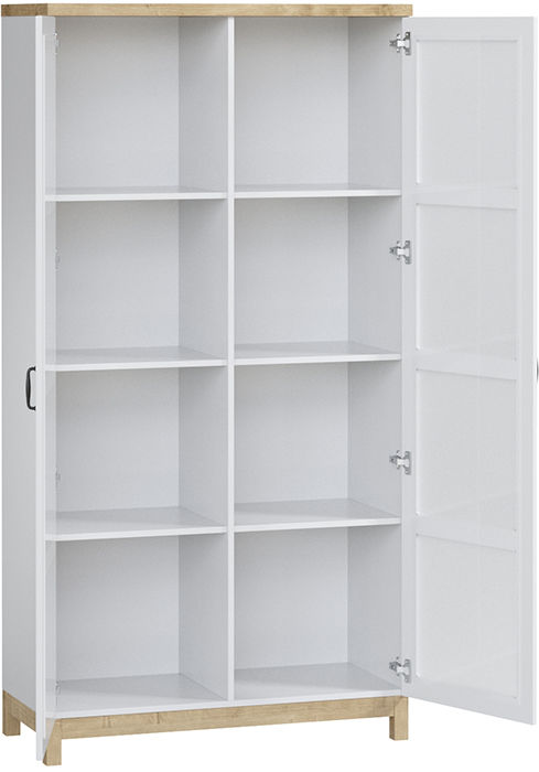 Компактная и вместительная двустворчатая витрина Равенна поможет организовать хранение в гостиной или спальне. Модель отличается эффектным сочетанием белых фасадов, матового стекла и элементов с текстурой дерева.