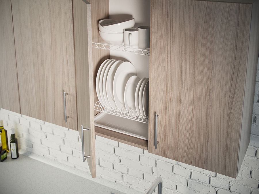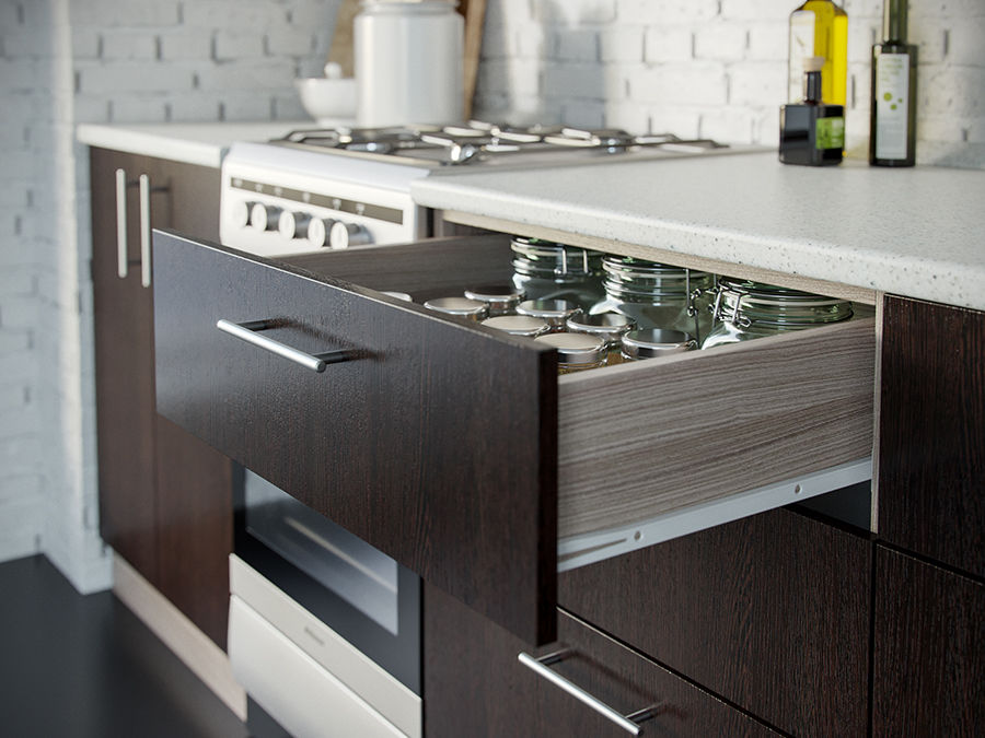 Грамотно организовать пространство на кухне поможет функциональный гарнитур. Все под рукой и одновременно на своих местах не об этом ли мечтает каждая хозяйка? В дизайне комплекта преобладают симметричные формы и четкие линии. Конструкция включает все необходимое: предусмотрено два ряда напольных и навесных шкафов. На полках удобно расположится посуда, кухонная утварь, мелкая бытовая техника, продукты. Тумба под мойку, выдвижные и распашные ящики позволят навести исключительный порядок.