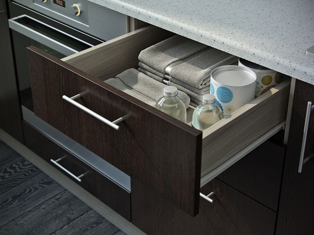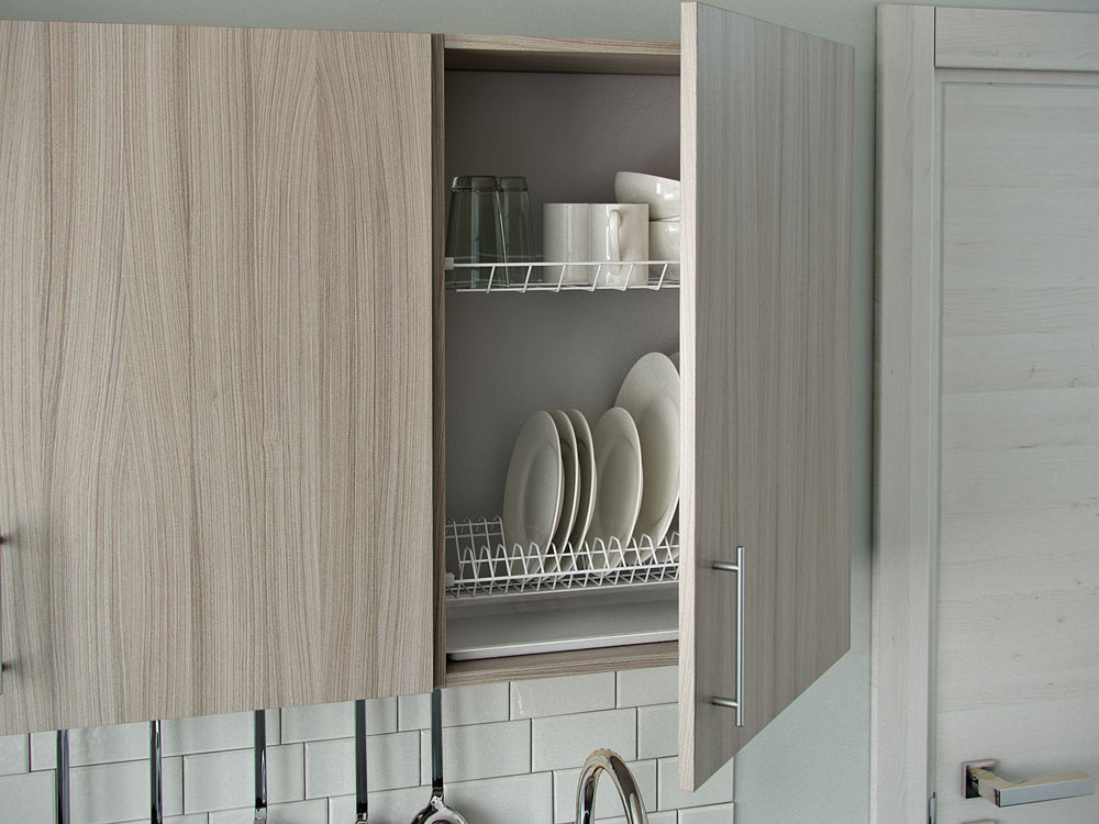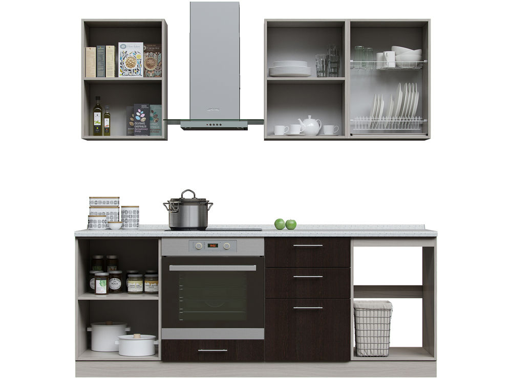 Грамотно организовать пространство на кухне поможет функциональный гарнитур. Все под рукой и одновременно на своих местах не об этом ли мечтает каждая хозяйка? В дизайне комплекта преобладают симметричные формы и четкие линии. Конструкция включает все необходимое: предусмотрено два ряда напольных и навесных шкафов. На полках удобно расположится посуда, кухонная утварь, мелкая бытовая техника, продукты. Тумба под мойку, выдвижные и распашные ящики позволят навести исключительный порядок.