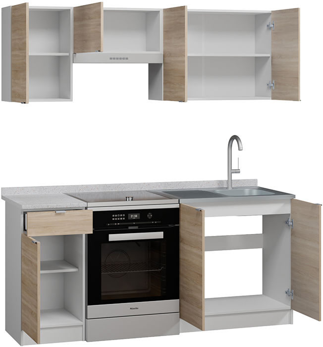 Кухонный гарнитур Мия-3 с вместительными шкафами для хранения посуды, столовых приборов и аксессуаров, которые понадобятся для кулинарных творений. Все элементы не зависят друг от друга и могут быть установлены в любом порядке. Двери на шкафы и тумбу можно навешивать с любой стороны. Мебель сделана из ЛДСП 16 мм, края обработаны кромкой ПВХ 0,4 и 2 мм. В ящике используются роликовые направляющие. Ручки на фасадах металлические. Столешница ЛДСП с влагостойким прочным покрытием постформинг.