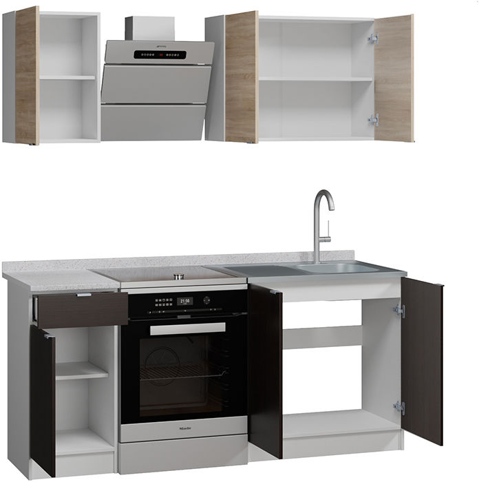 Кухонный гарнитур Мия-2 создан специально для маленькой кухни. В комплекте есть все необходимые модули для хранения посуды, столовых приборов и аксессуаров для готовки. Все элементы не зависят друг от друга и могут быть установлены в любом порядке. Двери на шкафы и тумбы можно навешивать с любой стороны. Мебель сделана из ЛДСП 16 мм, края обработаны кромкой ПВХ 0,4 и 2 мм. В ящике используются роликовые направляющие. Ручки на фасадах металлические. Столешница ЛДСП с влагостойким прочным покрытием постформинг.