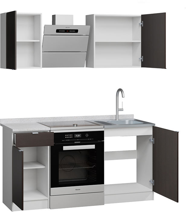 Кухонный гарнитур с большой рабочей поверхностью и вместительными шкафами для посуды и аксессуаров. Все элементы не зависят друг от друга и могут быть установлены в любом порядке. Двери на шкафы и тумбу можно навешивать с любой стороны. Мебель сделана из ЛДСП 16 мм, края обработаны кромкой ПВХ 0,4 и 2 мм. В ящике используются роликовые направляющие. Ручки на фасадах металлические. Столешница ЛДСП с влагостойким прочным покрытием постформинг.