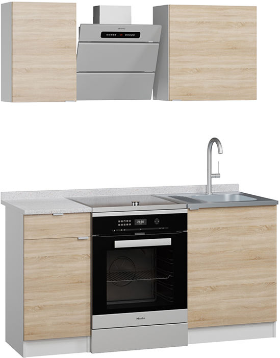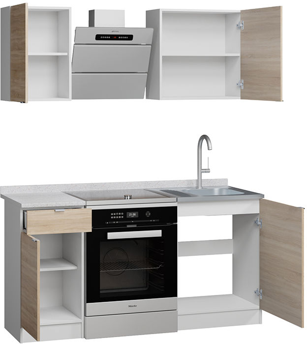Кухонный гарнитур с большой рабочей поверхностью и вместительными шкафами для посуды и аксессуаров. Все элементы не зависят друг от друга и могут быть установлены в любом порядке. Двери на шкафы и тумбу можно навешивать с любой стороны. Мебель сделана из ЛДСП 16 мм, края обработаны кромкой ПВХ 0,4 и 2 мм. В ящике используются роликовые направляющие. Ручки на фасадах металлические. Столешница ЛДСП с влагостойким прочным покрытием постформинг.