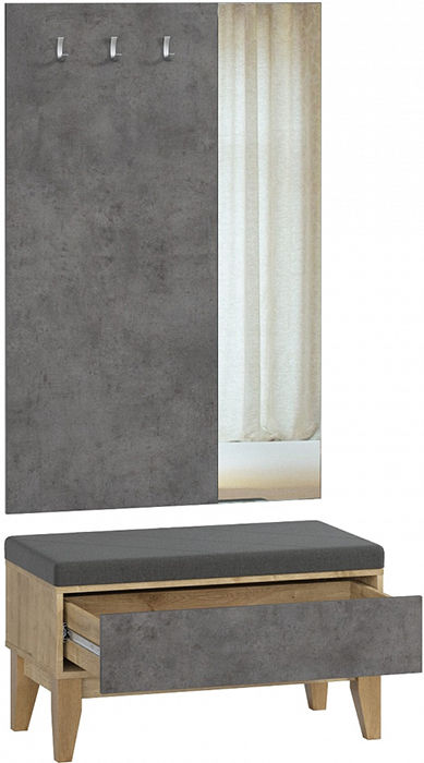 Прихожая Гритон отлично подойдет для небольшого коридора. Вытянутое зеркало, вешалки-крючки, мягкая банкетка с обивкой из рогожки и выдвижным ящиком здесь есть все, что нужно! Высокая функциональность сочетается в конструкции с актуальным дизайном. Эффектно смотрится сочетание бетонной поверхности и красивой древесной фактуры. Высокие ножки придают тумбе визуальную легкость.