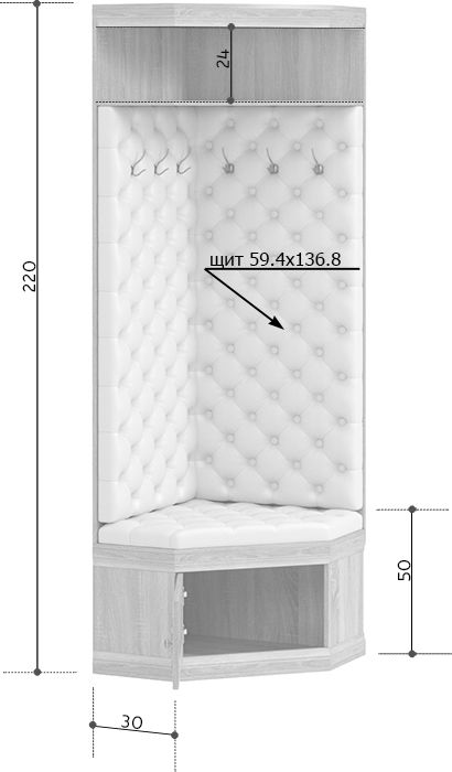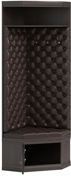 Удобная и компактная угловая прихожая достойно впишется в интерьер любой квартиры. В ее комплектации предусмотрено все необходимое: вешалка с металлическими крючками для верхней одежды, обувница и полка для аксессуаров. Вешалка и место для сидения декорированы мягкой стяжкой из экокожи. Прекрасно подойдет для небольшого помещения.