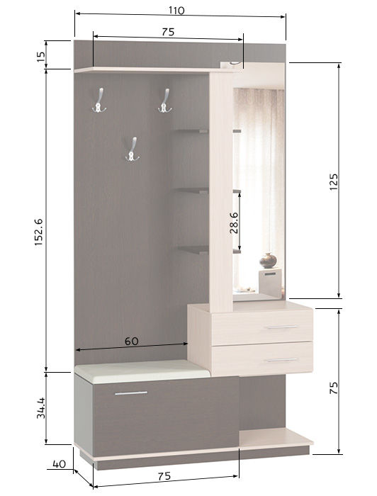 Размеры Ширина 110 см Глубина 40 см Высота 210 см