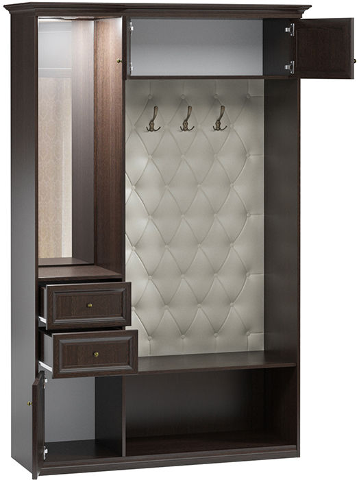 Прихожая Оксфорд объединяет в себе удобство и привлекательный дизайн. В ее конструкции есть все, что необходимо в коридоре: крючки для верхней одежды, закрытый шкаф с выдвижным кронштейном, полки для обуви и аксессуаров, зеркало. Классический дизайн, отделка искусственной кожей и оригинальная фурнитура сделают входную зону вашей квартиры элегантной.