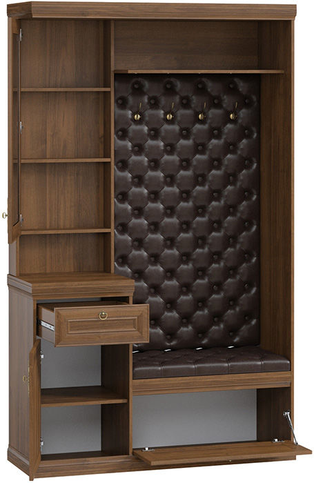 Удобная и функциональная прихожая достойно впишется в интерьер. В ее комплектации предусмотрено все необходимое: вешалка с крючками для верхней одежды, обувница с мягким сидением, полки для аксессуаров и зеркало. Ящик оборудован напровляющими 100% выдвижения, а вешалка и место для сидения декорированы стяжкой из экокожи.