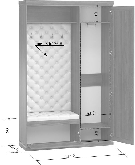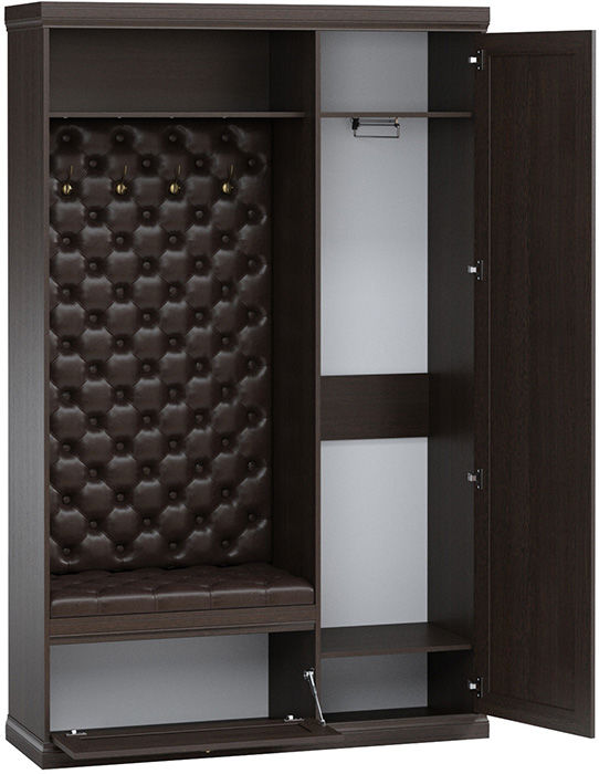 Удобная и функциональная прихожая достойно впишется в интерьер. В ее комплектации предусмотрено все необходимое: вешалка с крючками для верхней одежды, обувница с мягким сидением, закрытый шкаф с выдвижным кронштейном и полки для аксессуаров. Вешалка и место для сидения декорированы стяжкой из экокожи.
