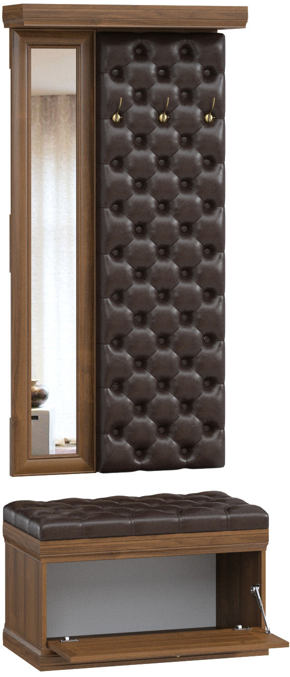 Удобная и компактная прихожая с зеркалом достойно впишется в интерьер. Она оснащена вешалкой с крючками для верхней одежды и обувницей сидением, которые декорированы мягкой стяжкой из экокожи. Прекрасно подойдет для небольшого помещения, обеспечив порядок во входной зоне квартиры.