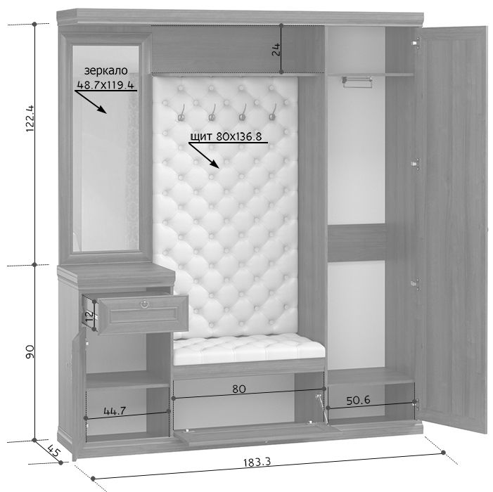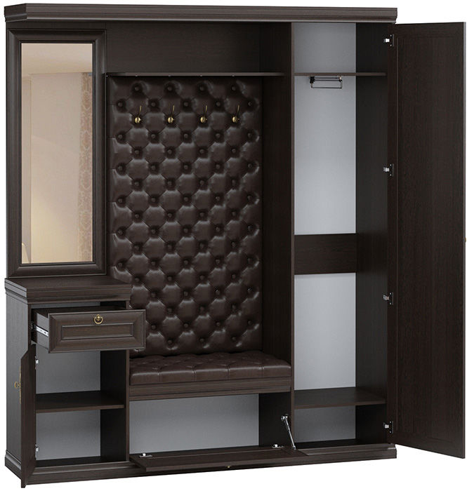 Удобная и функциональная прихожая достойно впишется в интерьер. В ее комплектации предусмотрено все необходимое: вешалка с крючками для верхней одежды, закрытый шкаф с выдвижным кронштейном, обувница с мягким сидением, полки для аксессуаров и зеркало. Ящик оборудован напровляющими 100% выдвижения, а вешалка и место для сидения декорированы стяжкой из экокожи.