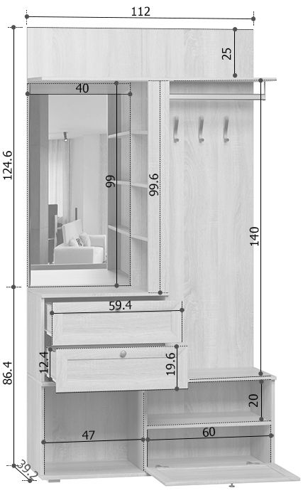 Размеры Ширина 112 см Глубина 40 см Высота 211 см