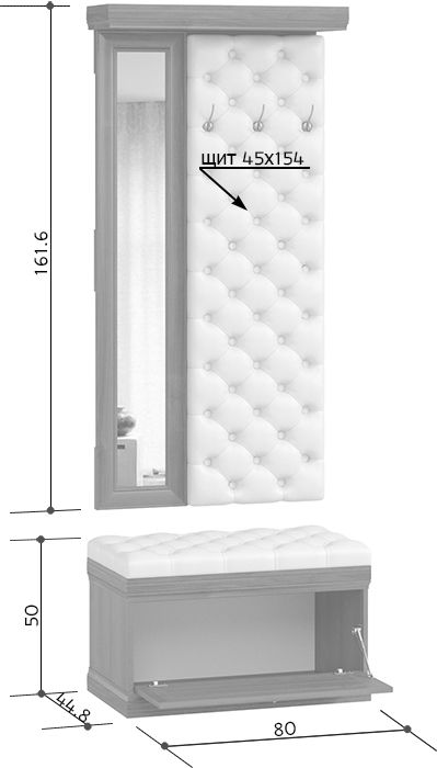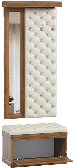Удобная и компактная прихожая с зеркалом достойно впишется в интерьер. Она оснащена вешалкой с крючками для верхней одежды и обувницей сидением, которые декорированы мягкой стяжкой из экокожи. Прекрасно подойдет для небольшого помещения, обеспечив порядок во входной зоне квартиры.