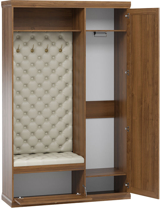 Удобная и функциональная прихожая достойно впишется в интерьер. В ее комплектации предусмотрено все необходимое: вешалка с крючками для верхней одежды, обувница с мягким сидением, закрытый шкаф с выдвижным кронштейном и полки для аксессуаров. Вешалка и место для сидения декорированы стяжкой из экокожи.