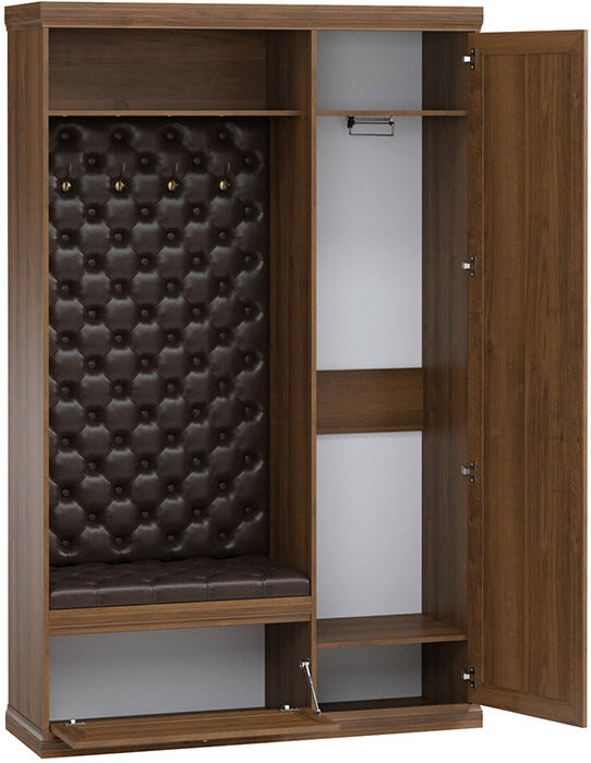 Удобная и функциональная прихожая достойно впишется в интерьер. В ее комплектации предусмотрено все необходимое: вешалка с крючками для верхней одежды, обувница с мягким сидением, закрытый шкаф с выдвижным кронштейном и полки для аксессуаров. Вешалка и место для сидения декорированы стяжкой из экокожи.