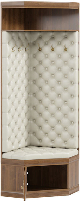 Удобная и компактная угловая прихожая достойно впишется в интерьер любой квартиры. В ее комплектации предусмотрено все необходимое: вешалка с металлическими крючками для верхней одежды, обувница и полка для аксессуаров. Вешалка и место для сидения декорированы мягкой стяжкой из экокожи. Прекрасно подойдет для небольшого помещения.