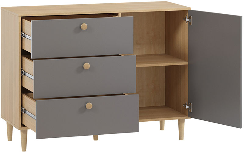 Двухсекционный комод Динс создан по мотивам скандинавского стиля. Основным выразительным средством является контраст натуральных фактур и строгих однотонных фасадов. Вместительная конструкция небольших габаритов будет уместна в интерьере любой комнаты.