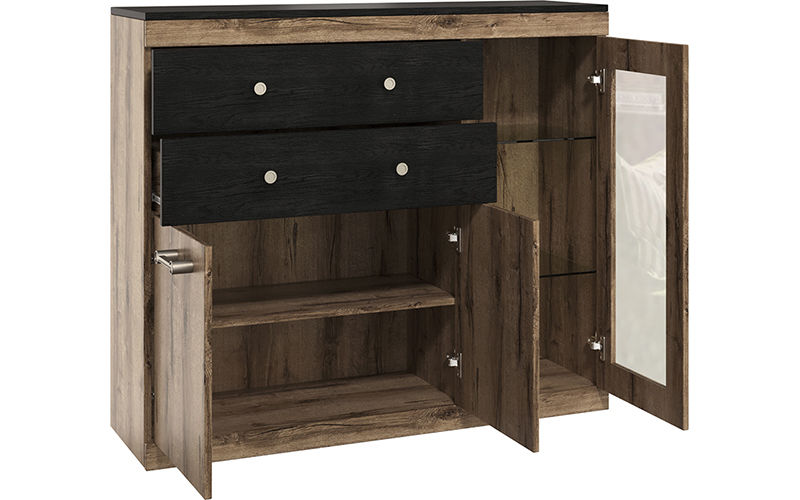 Стильный комод Джаггер найдет свое место в гостиной или спальне. Корпус в оттенке дуба оригинально сочетается со столешницей, фасадами черного цвета и темными стеклянными элементами. Модель может смело стать центральной фигурой в интерьере, сделать обстановку более привлекательной и удобной.