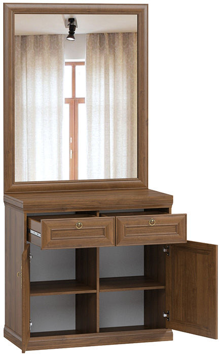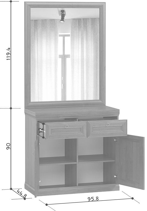 Удобный и функциональный комод легко впишется в интерьер. В его комплектацию входят вместительные полки, зеркало в рамке МДФ и ящики с напровляющими 100% выдвижения. Высота комода без зеркала 90 см.