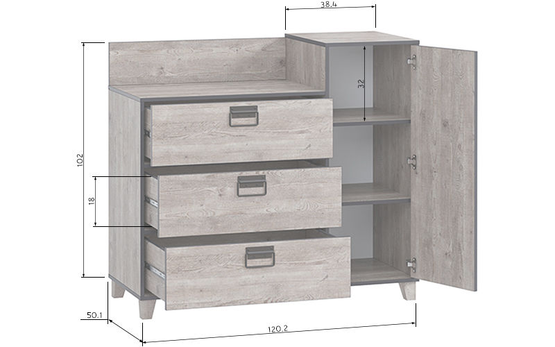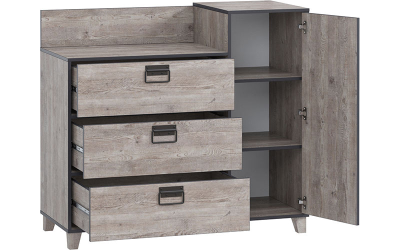 Компактный и функциональный, комод Эссен создан в лучших традициях индустриального интерьера. Стильный дизайн объединяет фактуру дерева с контрастной окантовкой и металл. Три выдвижных ящика позволяют рассортировать и удобно хранить постельные принадлежности и одежду. За распашной дверцей находится две полки здесь найдется место аксессуарам.