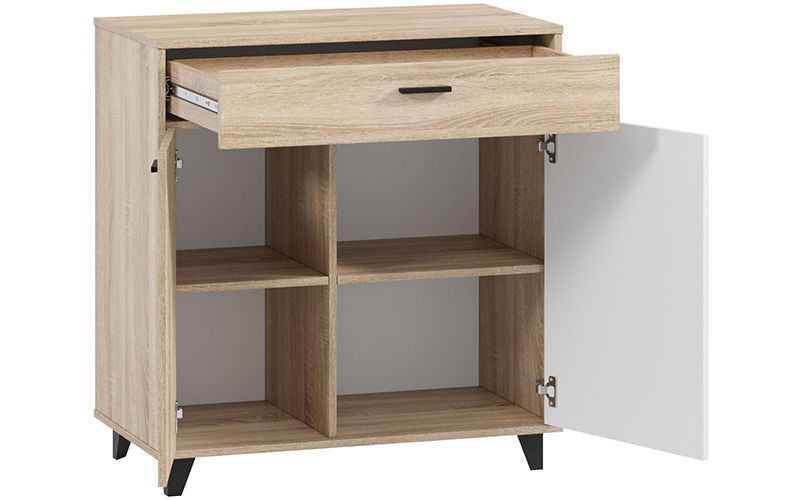 Комод Концепт-3 поможет поддерживать порядок в гостиной или спальне. Комбинация корпуса в оттенке Дуб Сонома и гладких матовых фасадов белого цвета беспроигрышно смотрится в любом современном интерьере! Сдержанный дизайн модели подчеркнут длинными узкими ручками из массива дерева.