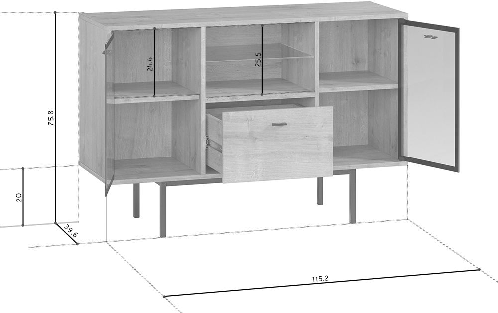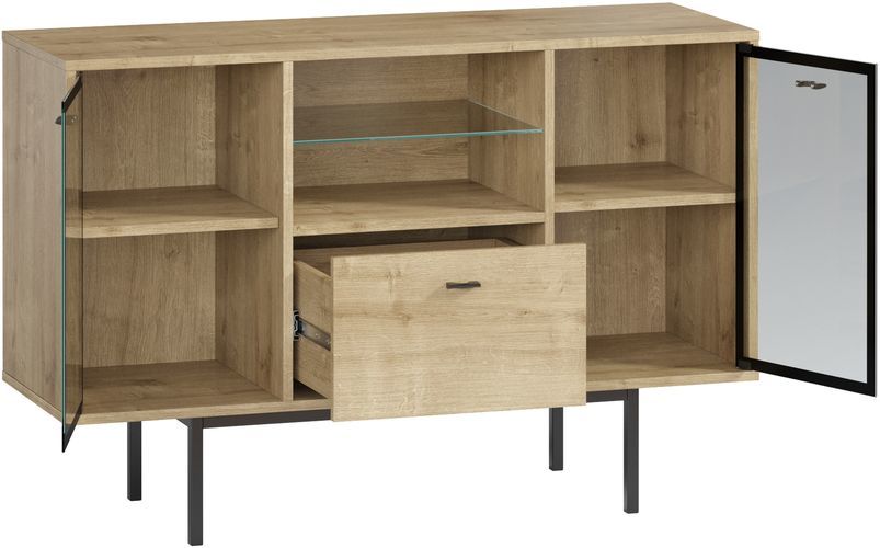 Невысокий комод Бруклин классическая система хранения в современном исполнении. Традиционно прямоугольная форма, но вместо скучного фасада с выдвижными ящиками прозрачные стеклянные дверки и удобные открытые полки.