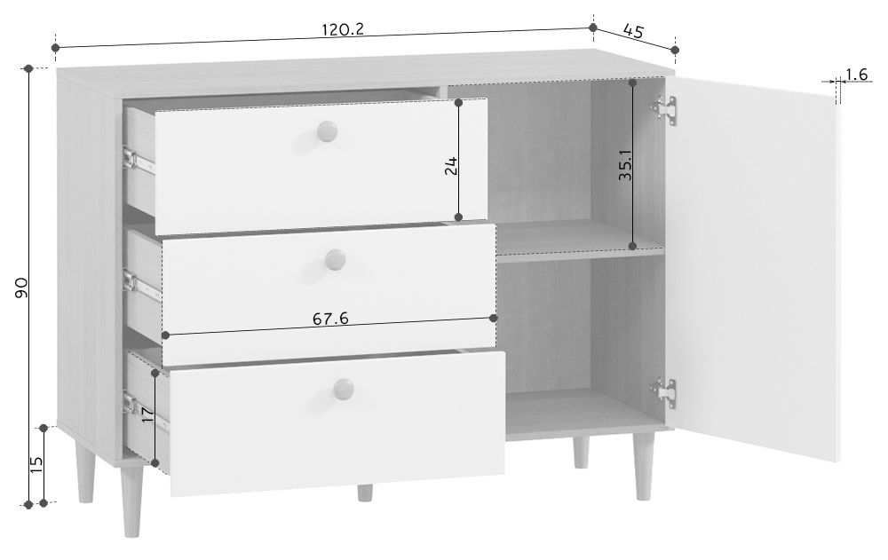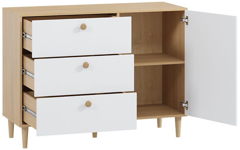 Двухсекционный комод Динс создан по мотивам скандинавского стиля. Основным выразительным средством является контраст натуральных фактур и строгих однотонных фасадов. Вместительная конструкция небольших габаритов будет уместна в интерьере любой комнаты.