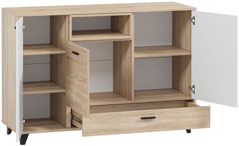 Комод Концепт-1 поможет поддерживать порядок в гостиной или спальне. Комбинация корпуса в оттенке Дуб Сонома и гладких фасадов беспроигрышно смотрится в любом современном интерьере! Сдержанный дизайн модели подчеркнут длинными узкими ручками из массива дерева.
