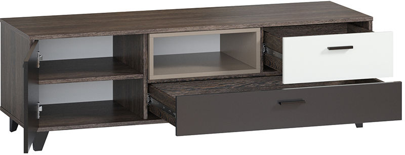 Стильная ТВ-тумба Концепт станет полезной деталью в помещении, где предусмотрено размещение мультимедийной техники. Широкая столешница, два выдвижных ящика, отсек с распашной дверцей и открытая ниша позволят разместить необходимое оборудование и аксессуары. А благодаря оригинальной отделке фасадов тумба внесет новизны в интерьер!