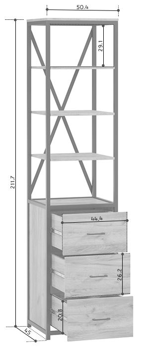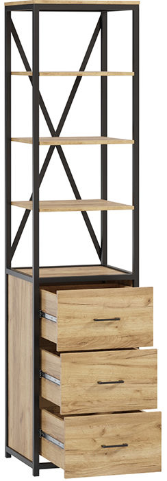 Комбинированная витрина-стеллаж Лофт станет функциональным украшением минималистичного интерьера. Геометричная конструкция из металлических перекрестий и жесткого каркаса соответствует брутальному стилевому направлению. Витрина подойдет для гостиной или кабинета. Открытые полки и три вместительных выкатных ящика позволят разместить все необходимые вещи. Каркас изделия выполнен из металлического профиля с сечением 25 х 25 мм.