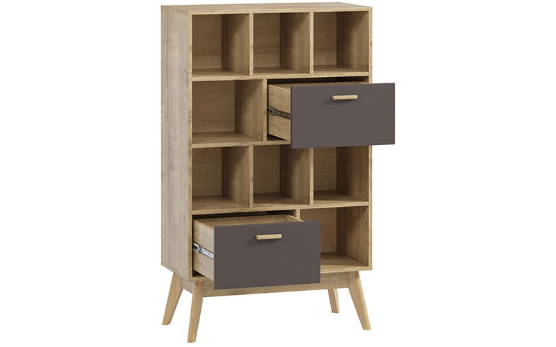 Стеллаж Нордик-3 дополнит обстановку современной спальни или гостиной. Приятная комбинированная расцветка, оригинальный дизайн, высокие ножки из массива березы главные особенности модели, благодаря которым она будет эффектно смотреться в лаконичном интерьере. Приподнятое над полом основание делают конструкцию стеллажа визуально легкой.