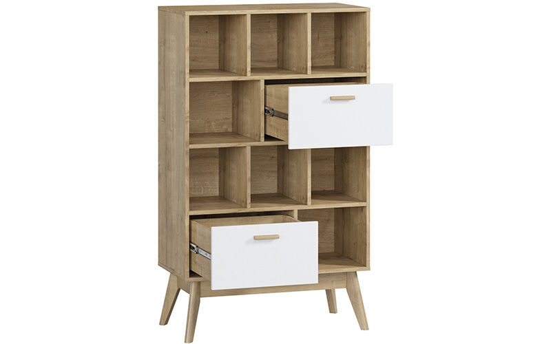 Стеллаж Нордик-3 дополнит обстановку современной спальни или гостиной. Приятная комбинированная расцветка, оригинальный дизайн, высокие ножки из массива березы главные особенности модели, благодаря которым она будет эффектно смотреться в лаконичном интерьере. Светлые оттенки и приподнятое над полом основание делают конструкцию стеллажа визуально легкой.