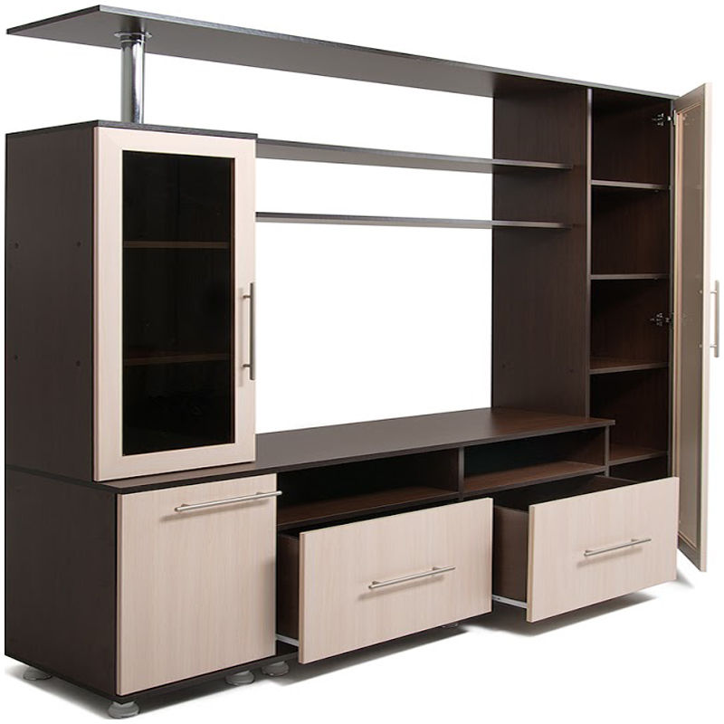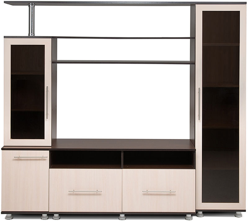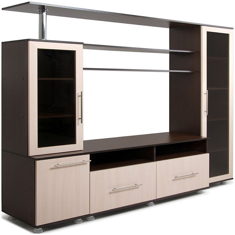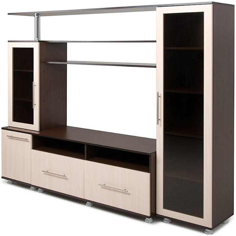 Компактная стенка Флора в стильном оформлении идеально впишется в небольшую гостиную. Благодаря эффектному сочетанию светлых деталей фасада оттенка молочный дуб и корпуса насыщенно-темного цвета венге, модель смотрится современно и не перегружает интерьер.