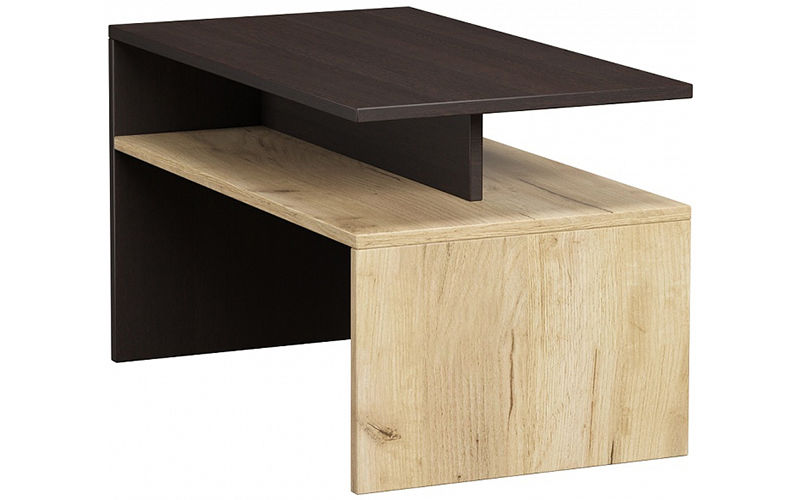Журнальный стол Дрезден неординарной геометричной формы для стильной гостиной. Модель весьма функциональна можно организовать чаепитие, пространство для игр детей или занятия рукоделием. Под столешницей находится полка, разделенная перегородкой. Накладки на опорах защитят напольное покрытие. Стол изготовлен из ЛДСП в контрастных оттенках натурального дерева, благодаря чему выглядит уютно и эффектно.