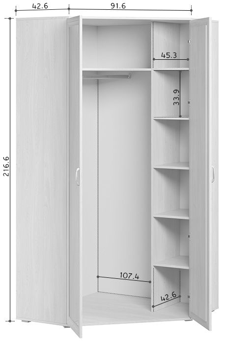 Угловой шкаф Мелита решит проблему хранения одежды и спальных принадлежностей даже в небольшом помещении. Вместительная конструкция максимально эффективно задействует площадь, оставляя свободное место для других предметов интерьера.