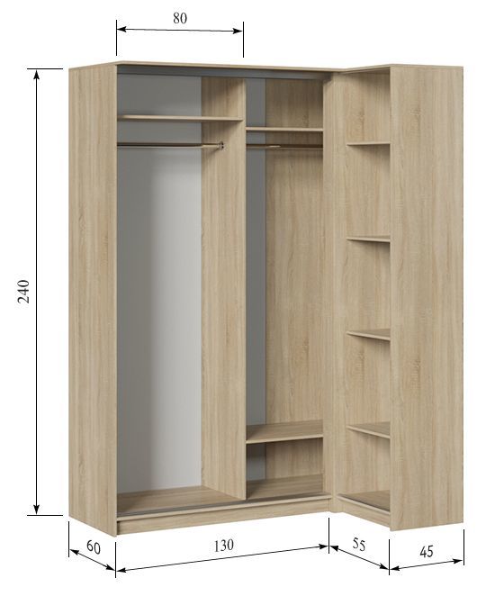 Современный угловой шкаф решит проблему хранения одежды и домашних принадлежностей даже в небольшом помещении. Эргономичный и вместительный, он с разумной прагматичностью использует каждый сантиметр пространства. Доступ к внутренней части получается легким благодаря современной системе направляющих. А наличие ленты-щетки предотвращает попадание пыли внутрь шкафа, а так же способствует бесшумному открыванию и закрыванию створок.
